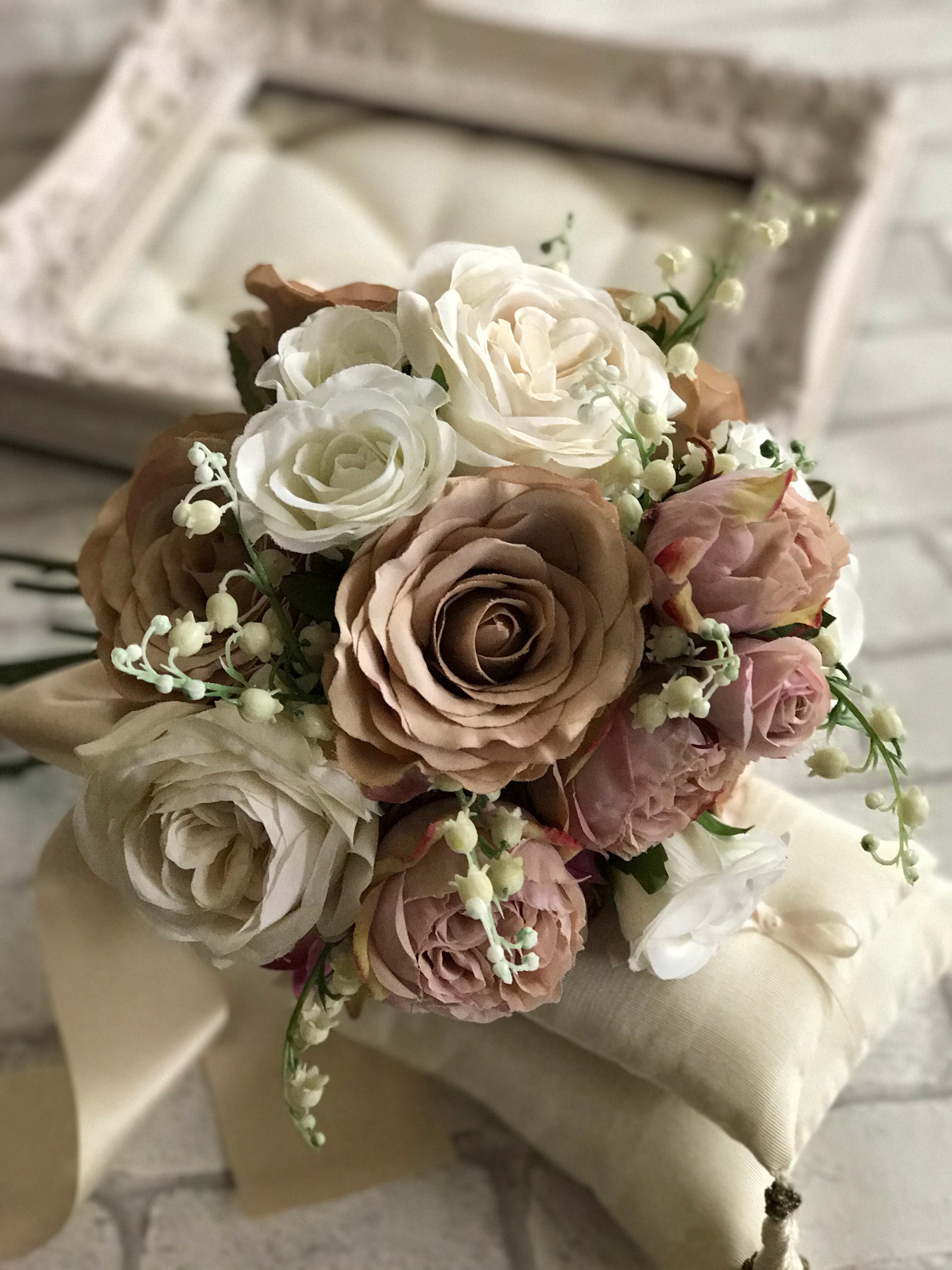 アーティフィシャルフラワー(造花)のスズランとバラをたっぷり使って、ナチュラルだけどエレガントな雰囲気のブーケです♪