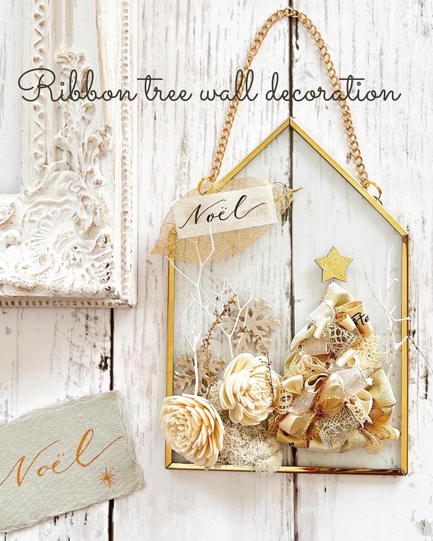 何種類ものリボンを使って作るツリーをデコレーションした、クリスマスのミニ壁掛けです♡